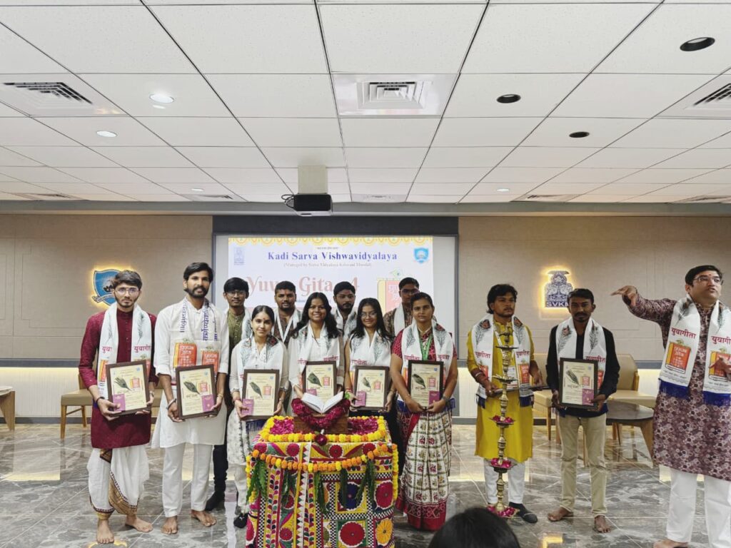કડી સર્વ વિશ્વવિદ્યાલય દ્વારા પાંચ દિવસીય નિવાસી યુવા ગીતા પરિચય શિબિર- ૦૪ તા: ૧ થી ૫ ડિસેમ્બર, ૨૦૨૫ દરમિયાન કડી ખાતે ભવ્ય આયોજન કરવામાં આવ્યું હતું જેમાં ૨૧ કોલેજોમાંથી ૮૦ વિદ્યાર્થીઓ ઉપસ્થિતિ રહ્યા હતા. મુખ્ય વક્તા તરીકે યુવા ગીતા કોઓર્ડીનેટર ઉર્વીશભાઈ પટેલ તેમજ મહેમાન વક્તા તરીકે ડૉ. ગોપાલ ઉપાધ્યાય દ્વારા યુવાનોને મા ગીતાનું તેજસ્વી જ્ઞાન પીરસવામાં આવ્યું હતું આમ અદ્દભુત પ્રકલ્પ યુવાગીતા થકી જીવિકાલક્ષી શિક્ષણની સાથે સાથે યુવાનો જીવનલક્ષી શિક્ષણ મેળવીને કૃતાર્થ થયા હતા.